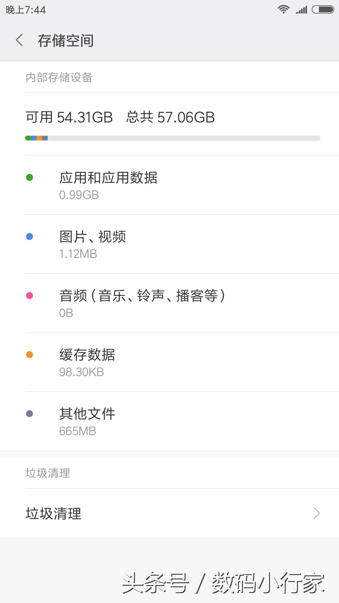 最后看了下存储空间,64G的空间,实际57.06G,到手可用54.31G,系统占用了2.75G,64G空间现在来看还是比较够用的,16G版的少不了要用TF卡