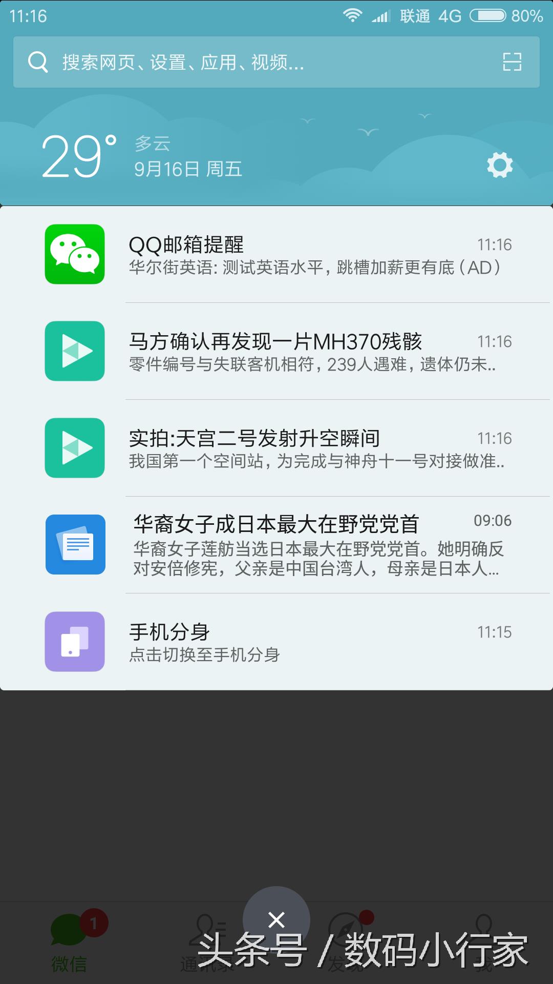 默认界面只有两页,比较简单,内置了一些应用,都可卸载,使用了一会后,下滑菜单,各种推送果然来了,对于一个喜欢纯净的人,果断把他们的推送权限都取消了 。