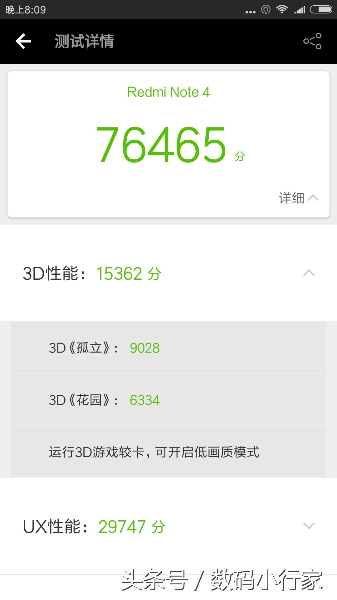 2、跑分,76465分,参考位置,魅族pro5左右,兔兔君提示3D游戏较卡,可开启低画质模式 ,跑分不完全代表体验,仅参考参考就好