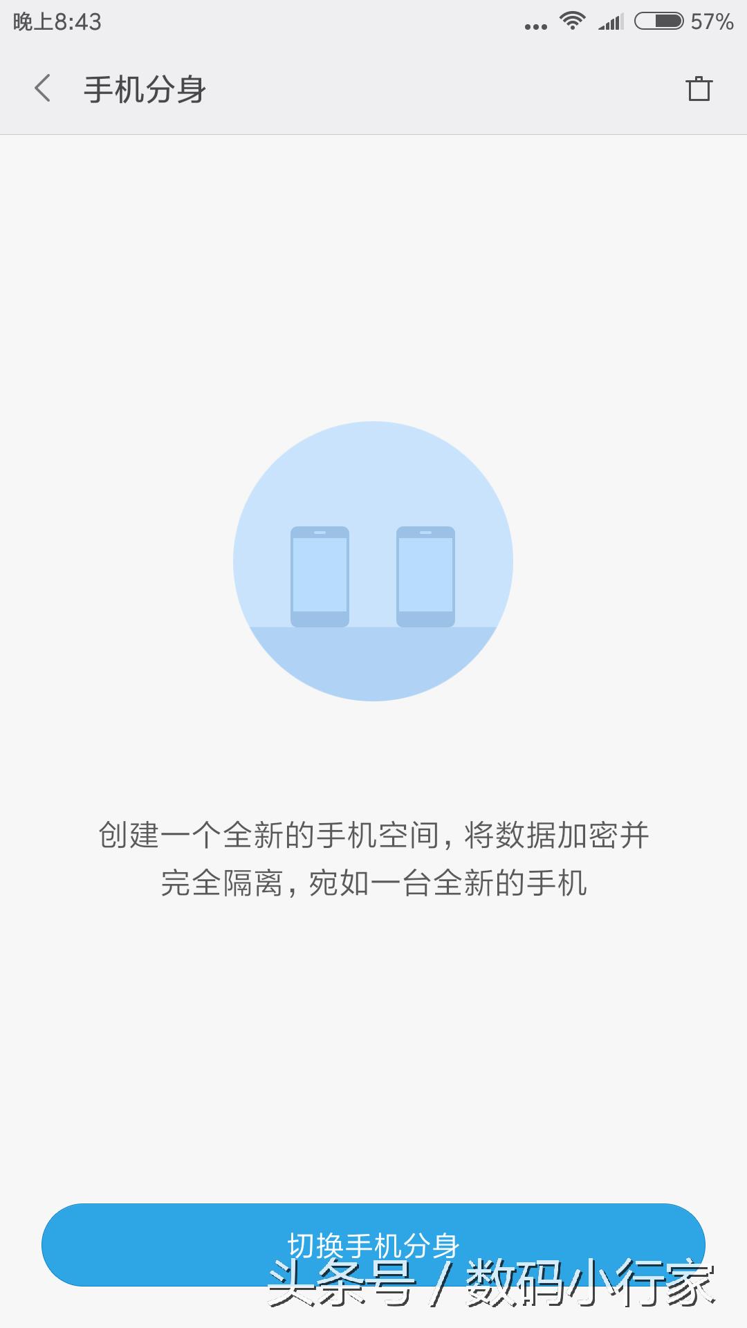2、手机分身,注意,这个不是应用分身,而是手机整个系统分身,有点像360之前推出的不同解锁密码进入不同系统的功能,不过不同的是,小米的手机分身要在进入系统之后点击切换的。