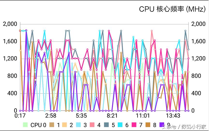 下面上一张全状态下CPU频率图,本次测试持续15分钟,基本把手机性能开满了(挺热的),我们看到红米Note4 CPU采用的是联发科Helio X20,十核处理器,坊间谣传一核有难九核围观,从这个测试来看坊间谣传还是有点夸张,毕竟一核有难其他九核还是会出出力的,不过也有不少偷懒的,看看CPU8号和CPU9号这两个兄弟频率只开了一半不到。