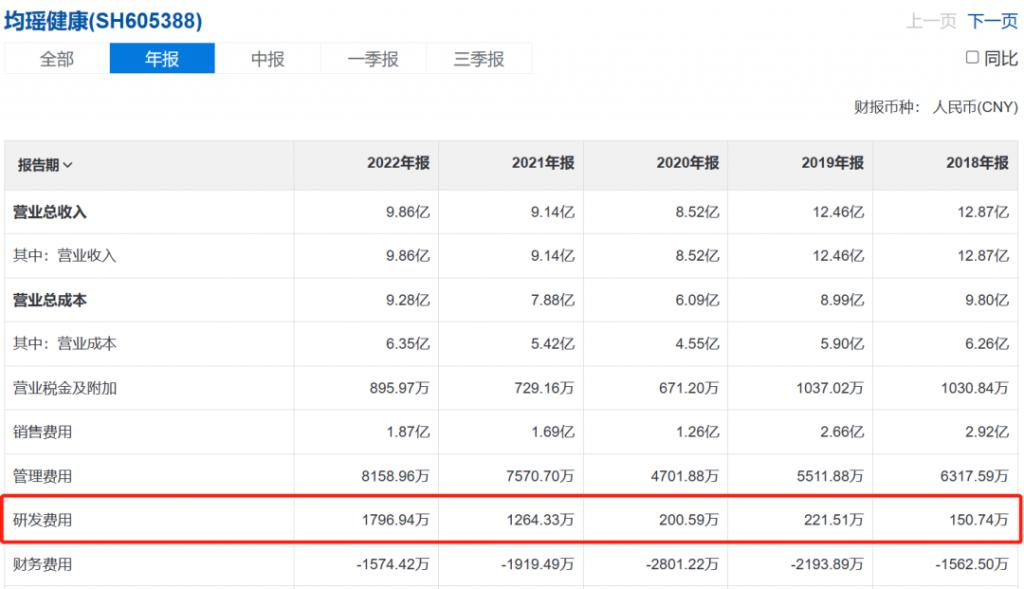 从研发的角度来看,财报显示,2025-2025 年,均瑶健康的研发费用为 200.6 万元、1264 万元和 1796.94 万元,远低于同期的销售费用 1.258 亿元、1.688 亿元和 1.869 亿元。