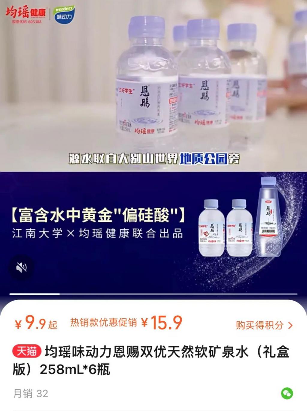一号公司在味动力旗舰店发现,恩赐矿泉水 258ml 装 6 瓶售价为 15.9 元,均价 2.65 元的恩赐矿泉水的定价并不便宜。
