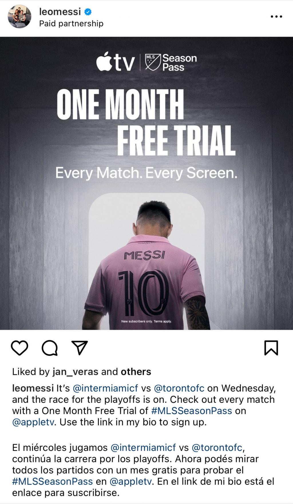 梅西在社交账户上推广 Apple TV 的 MSL 季票 |Instagram