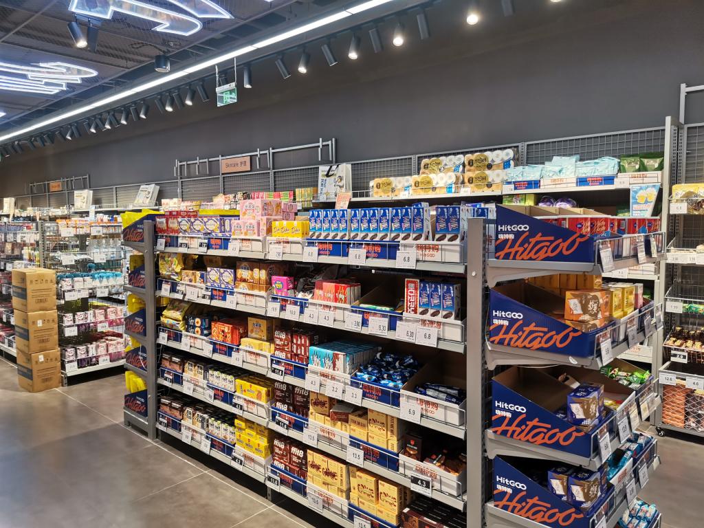 从记者近期的走访来看,食品、美妆产品仍是主角。记者来到嗨特购银泰中心店,已是下午两点,部分货架的产品已经卖空,来店里买零食,饮料的客人居多,店员一面给客人结账,一面熟练地向客人推荐会员活动。
