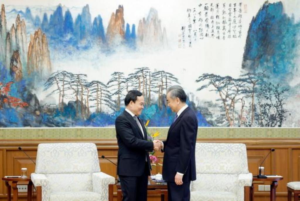 4 月 8 日,中共中央政治局委员、中越双边合作指导委员会中方主席王毅在北京应约会见陪同越南国会主席王庭惠访华的越南副总理、越中双边合作指导委员会越方主席陈流光 图:外交部网站