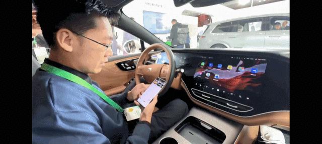 而在现场的飞凡汽车智能座舱中,当用户在手机上打开适配应用的页面,冲着车机一甩,其中的电影、音乐等内容就会自动在车机上打开,真正实现了把手机和车机融合为一个整体。