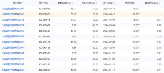 诚通控股为国资委控股的央企,联合资信在今年 3 月的最新评级为 AAA。据企业预警通,诚通控股共有 86 只存续债券,规模 1762.22 亿元。在 30 年期的 "24 诚通控股 MTN009B" 之前,今年诚通控股已发行多只期限 10 年以上的中票,包括 15 年、20 年,发行利率逐步下行。