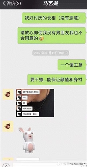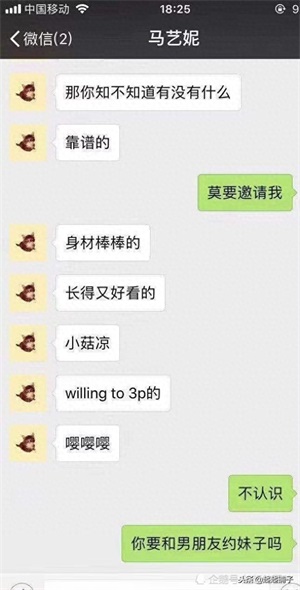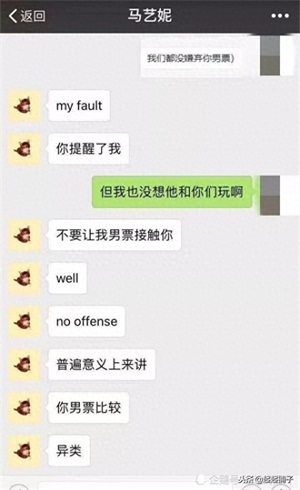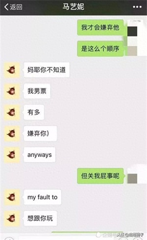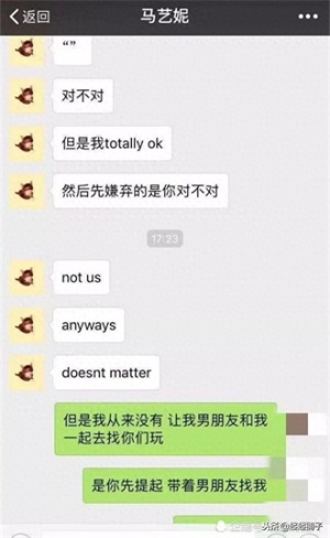 近日有网友爆料马艺妮为了男友宋思睿约一北大妹子三人很不好的事情,遭到北大妹子拒绝,再看到其男友(宋思睿)照片,后更加拒绝,称其男友长相正好是自己讨厌的类型,马艺妮恼羞成怒,拿英文连环diss该女生,导致该女生一怒之下将聊天记录曝光于朋友圈。