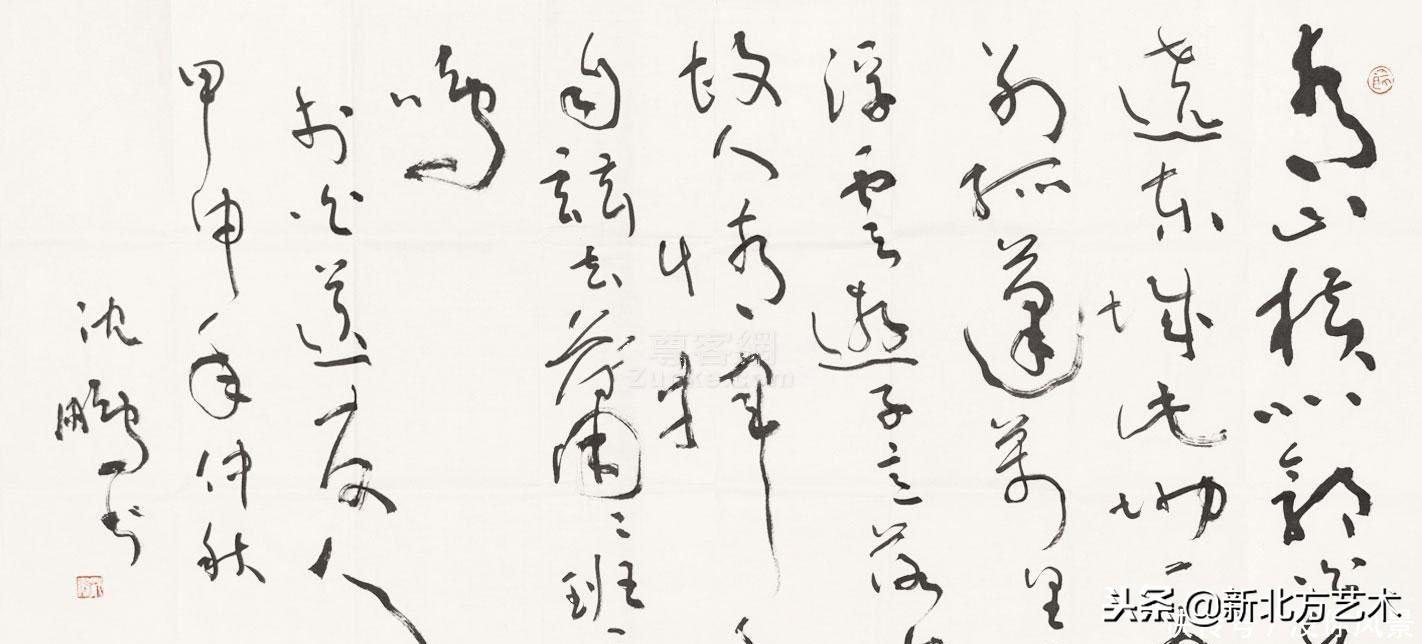 有人说:“沈鹏是继启功以后最后一位书法大家!”他的主要成就在草书方面。沈鹏习草几十年,其草书作品中,无不流露出草圣张芝、书圣王羲之、以及王献之、张旭、怀素书法的元素和影子,这说明什么呢?说明沈鹏的书法是沿袭着古人的路子走过来的,是有深厚的传统根底支撑着的。