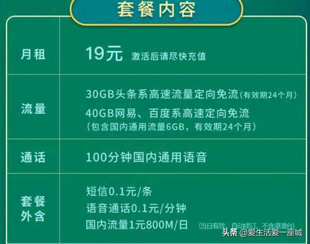 19元套餐中包含了100分钟的语音通话、70GB定向流量、6GB国内通用流量和百余项APP定向免流,超出套餐外的流量使用为1元800M/天,通话为0.1元/分钟!大家看了之后还是感觉还是不错的,都表示:电信的套餐终于良心了!”值得注意的是这款套餐的原内容的40G定向流量和30GB的头条系定向流量使用期限只有24个月的有效期!但总体来说,这24个月内电信这款套餐性价比和实用性非常不错,可过期以后实用性就大不如从前了!
