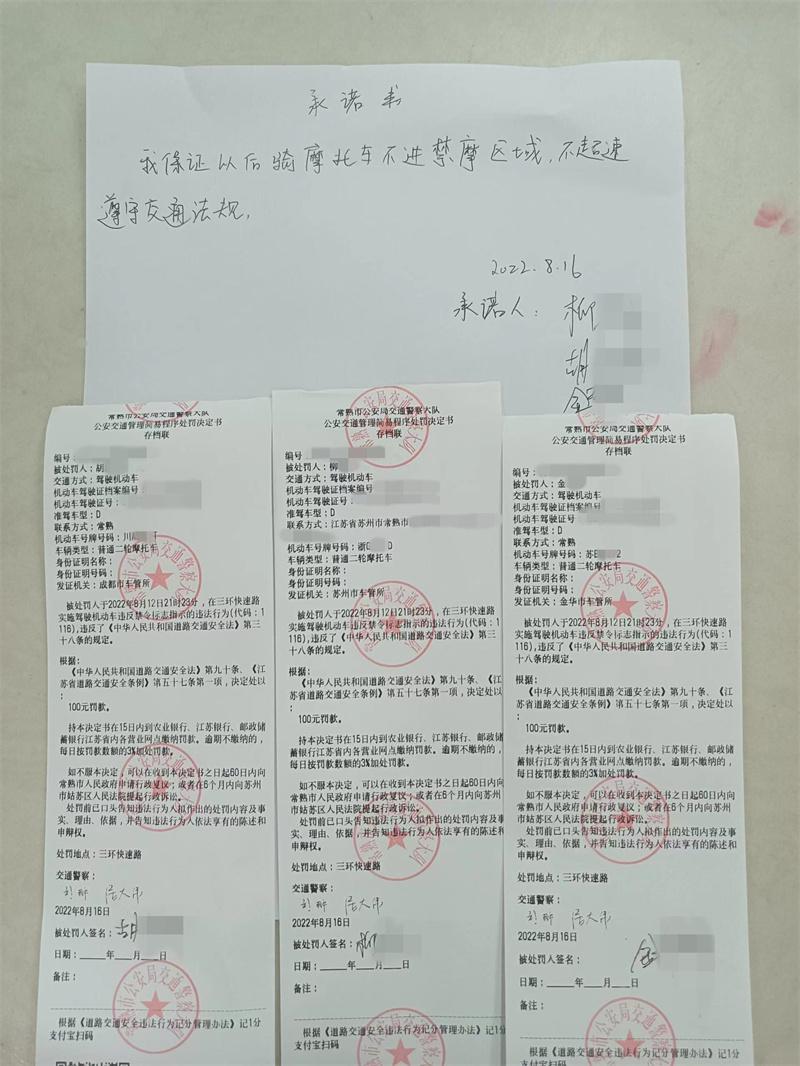 确定信息后,民警通过后台查询,立即锁定了三名交通违法驾驶人胡某、金某和柳某。8 月 16 日晚,三名驾驶人先后至五星中队接受处罚。经询问得知,事发当日晚,胡某驾驶普通二轮摩托车搭乘杨某行驶至昆承湖附近时,遇到同样驾驶二轮摩托车的金某及柳某,胡某提议拍个视频,于是三人便在明知摩托车不能上高架的情况下抱着侥幸心理驾驶二轮摩托车上了高架,期间由柳某搭载的乘员拍摄了视频,并于 8 月 14 日凌晨发布至某公共平台。对于自己的违法行为,三人表示已深刻反省,并写下保证书称今后定不再犯。
