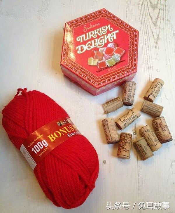 准备材料:空糖果盒、用过的软木塞、红色毛线、毛线针、卡纸跟颜料。