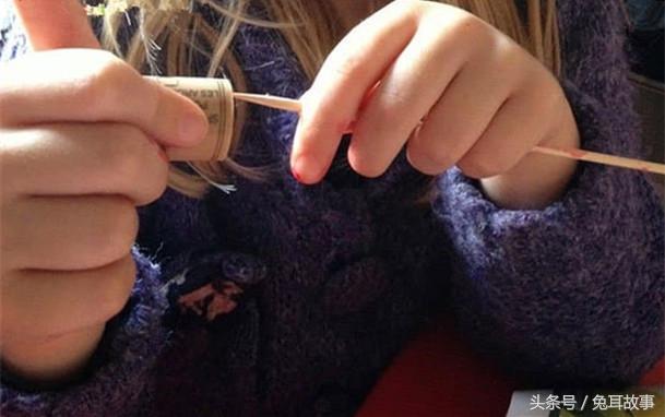 在软木塞上打个洞。打洞的时候一定要注意安全,用力要小心免得被毛线针扎到手上。