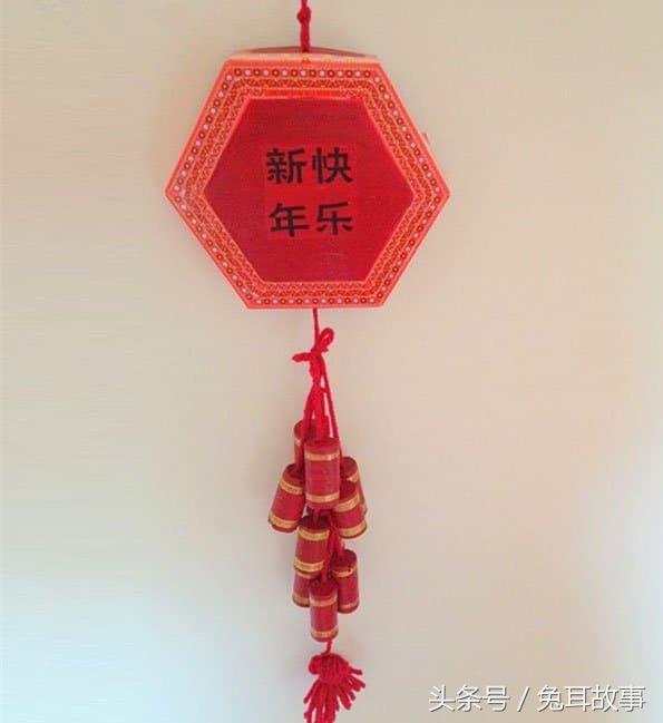 最后在卡纸上写上新年快乐然后贴到空糖果盒上,在用红色毛线将糖果盒、软木塞穿起来。这样一个环保手工鞭炮就制作完成了。