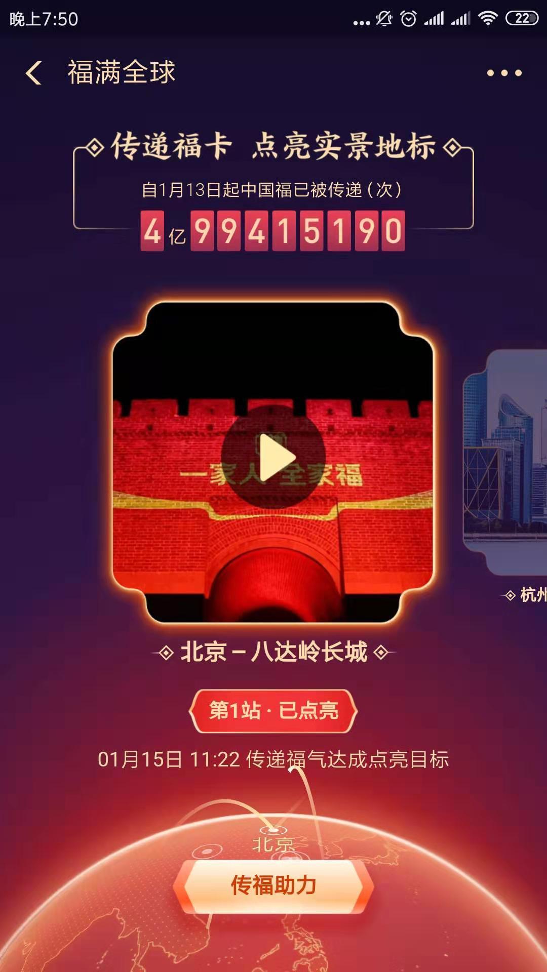 福满全球界面中,通过传递福卡,大家可以点亮实景地标,有北京、杭州、成都、上海、广州、阿联酋、西班牙、澳大利亚和南极共9站,大家快去点开里面每一个点亮的小视频吧~