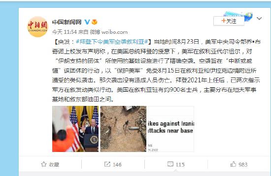 当地时间 8 月 23 日,美军中央司令部乔 • 布奇诺上校发布声明称,在美国总统拜登的授意下,美军在叙利亚代尔祖尔,对 " 伊朗支持的团体 " 所使用的基础设施进行了精确空袭。空袭旨在 " 中断或威慑 " 该团体的行动,以 " 保护美军 " 免受 8 月 15 日在叙利亚和伊拉克边境附近所遭受的类似袭击。那次袭击没有造成人员伤亡。拜登 2025 年上任后,已两次指示军方在叙发动类似行动。美国在叙利亚驻有约 900 名士兵,主要分布在坦夫军事基地和叙东部油田之间。