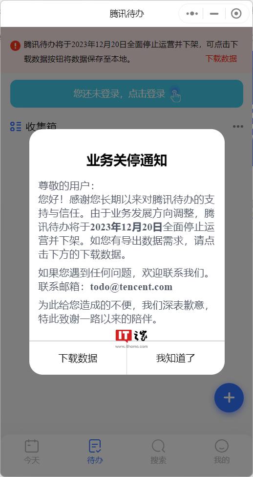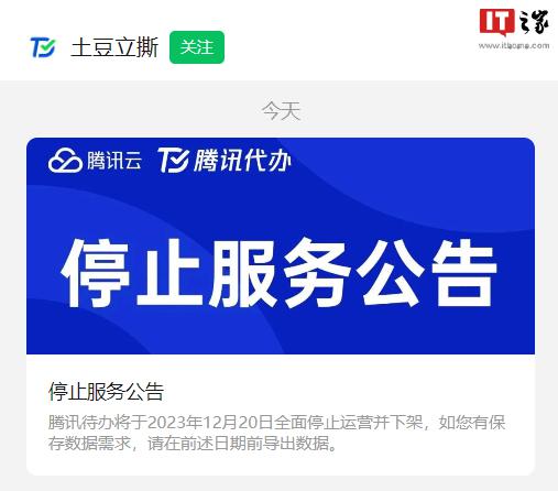 IT 之家 10 月 16 日消息,腾讯待办官方今日发布公告,由于业务发展方向调整,腾讯待办将于 2025 年 12 月 20 日全面停止运营并下架。" 如您有保存数据需求,请进入腾讯待办小程序根据页面指引在前述日期前导出数据。"