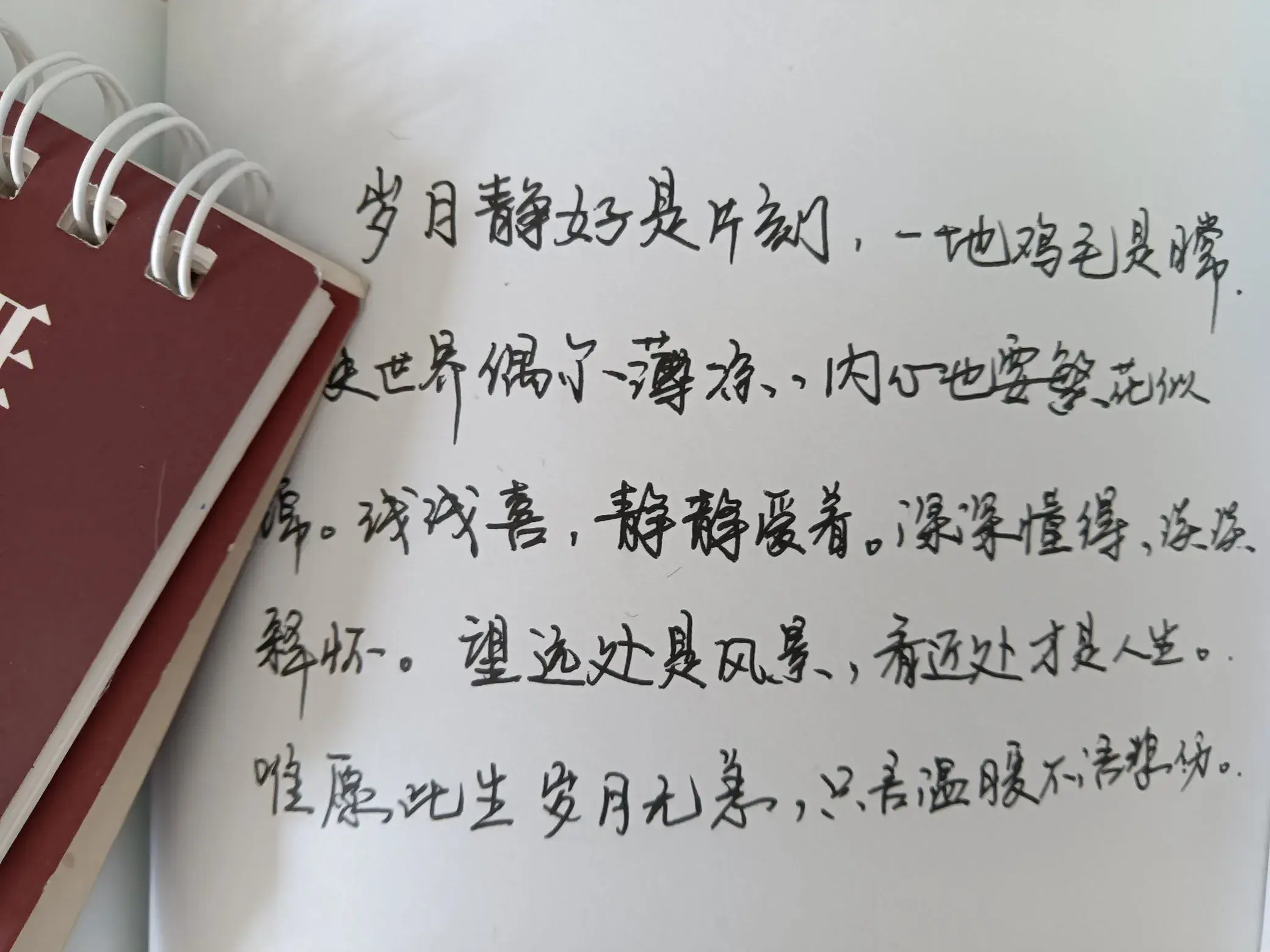 今天抄写的是杨绛先生的这一段话,先生说:岁月静好是片刻,一地鸡毛是日常。我觉得大多数时候岁月静好,是人的一种心态,感觉好便是好,感觉糟便是坏。就像今天的日子,没有计划趁着空闲的一会儿时间出来游逛一圈,也便是一种岁月静好了。