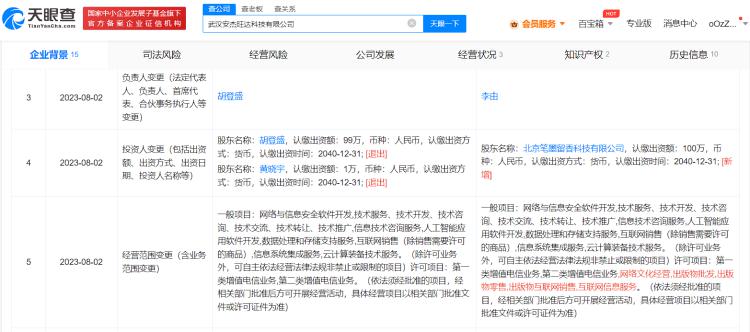 品玩 8 月 4 日讯,天眼查 App 显示,近日,武汉安杰旺达科技有限公司发生工商变更,原股东、法定代表人、主要人员均退出,新增抖音集团旗下北京笔墨留香科技有限公司为股东并全资持股,新增李由为法定代表人、执行董事、经理,金黄龙为监事。