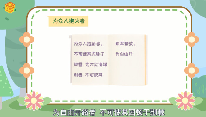 “为众人抱火者”的原文为:为众人抱薪者,不可使其冻毙于风雪。为大众谋福利者,不可使其孤军奋战。为自由开路者,不可使其困顿于荆棘。