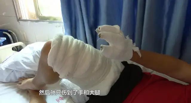 贵钢医院烧伤整形科医生 赖俊杰:大腿外侧的皮肤,还有右手的 5 个手指受到灼烧的影响还是比较大的,但是幸好没有伤到深部的神经以及肌腱的组织。我们考虑的是患者摔倒以后,在严重的外力作用下,导致手机的电池或者是里面的电路元件发生了短路,从而引起的爆炸。