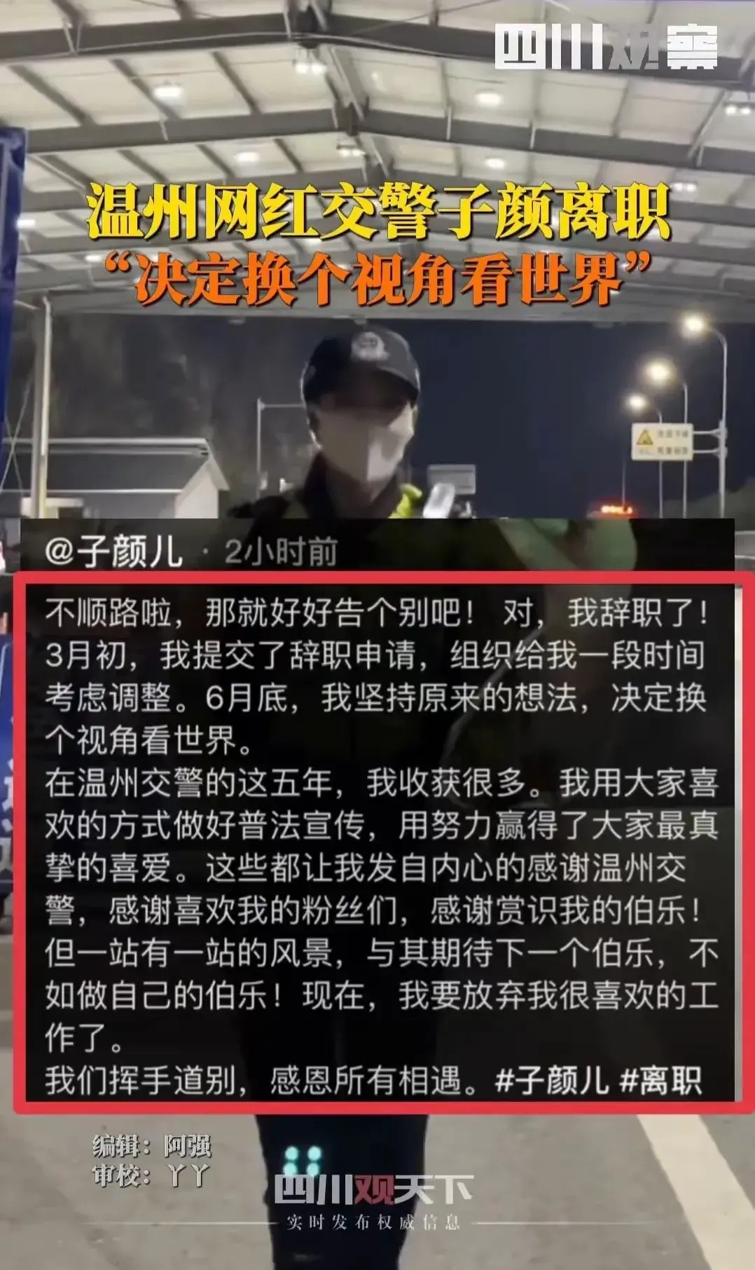 闹大了!温州网红交警子颜宣布离职,疑因没能提升,网友炸锅了
