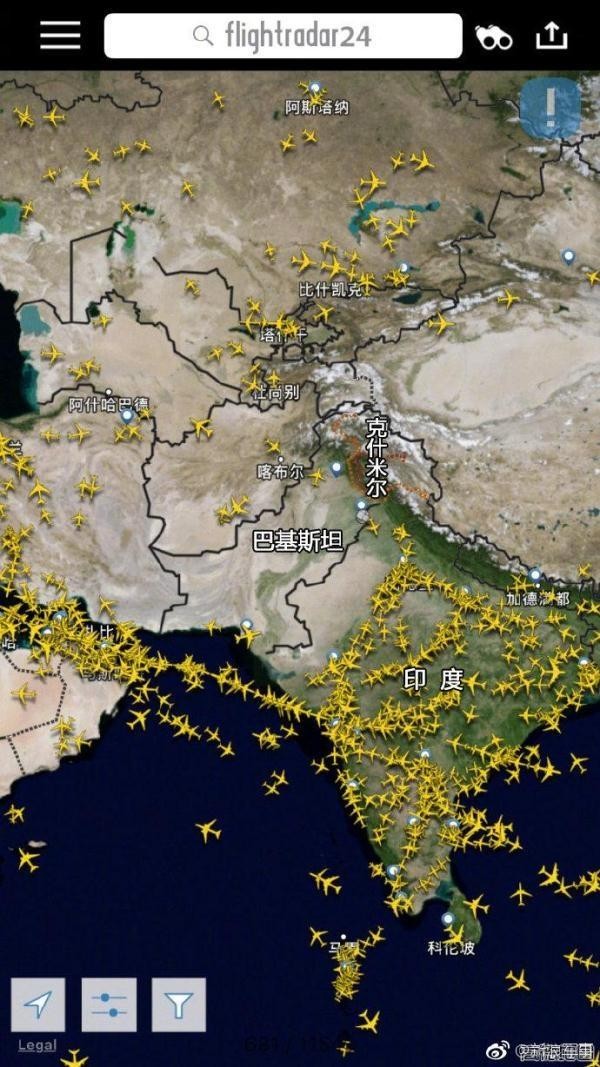 因印巴在克什米尔地区上空爆发冲突,目前已没有航班飞越巴基斯坦上空,印度靠近巴基斯坦的地区上空也基本没有航班飞行。