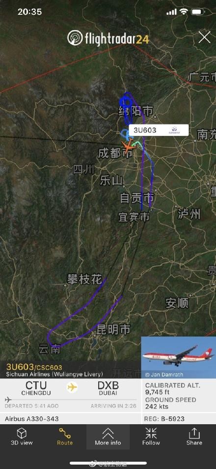 巴基斯坦关闭领空 川航3U603成都飞迪拜航班被迫返航 空中盘旋6小时30圈降落
