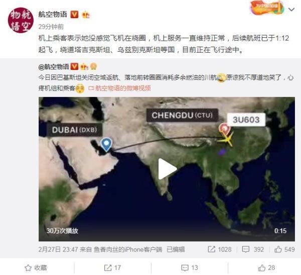 28日清晨,@航空物语再次发文称,川航的后续航班已于1:12起飞,绕道塔吉克斯坦、乌兹别克斯坦等国,目前正在飞行途中。