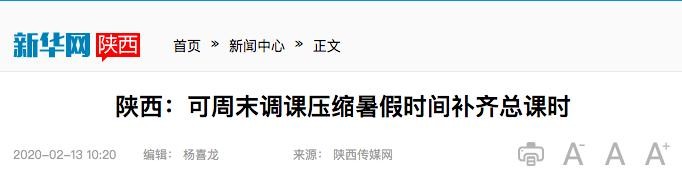 2月11日,陕西省新型冠状病毒感染的肺炎疫情防控工作情况第十场新闻发布会上,陕西教育系统新冠肺炎疫情防控工作领导小组常务副组长、省委教育工委委员、省教育厅副厅长赵昶葆表示,“各地各校后续可采取周末调课、压缩暑假时间等方式补齐总课时。”