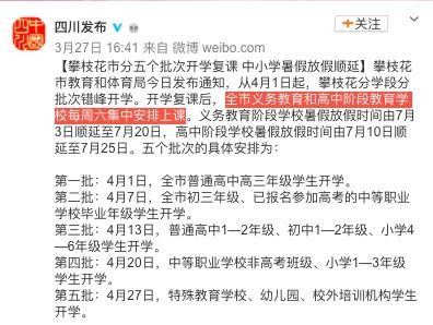 此外,四川攀枝花市教育和体育局近日也发布通知,从4月1日起,攀枝花分学段分批次错峰开学。开学复课后,全市义务教育和高中阶段教育学校每周六集中安排上课。义务教育阶段学校暑假放假时间由7月3日顺延至7月20日,高中阶段学校暑假放假时间由7月10日顺延至7月25日。