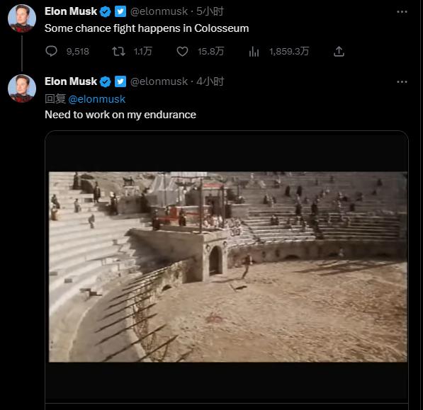 马斯克写道,格斗比赛有可能发生在斗兽场(Colosseum),他还附上了一段上世纪 70 年代英国喜剧电影《万世魔星》(Life of Brian)中男主角在罗马斗兽场角斗的搞笑视频。