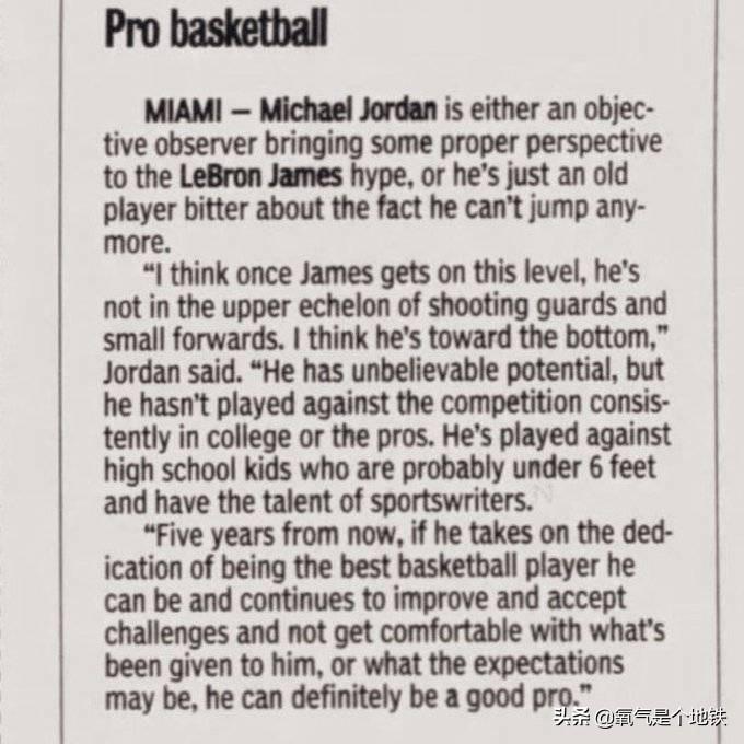 詹姆斯的天赋毕竟历史罕见,连选秀眼光差到被公认的乔丹都看得出这个新秀将来会非常厉害。为了支持自己的观点,同时表达对詹姆斯的重视,乔丹甚至在詹姆斯高中比赛时就到了观众席上观看他的比赛,并在球员通道上跟他见面。此外,乔丹也着重评价过詹姆斯,而那篇报道最近被媒体曝光。