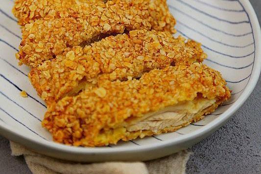 燕麦片和捏碎的薯片差不多,所以也是可以用来做炸鸡的,而且燕麦的营养价值可比薯片高多了。当然,用燕麦片做炸鸡排也很好吃,口感酥脆,一点不比用面包糠炸的差。咬在嘴里,还有一股浓郁的燕麦香,这滋味只能你亲自感受一下了。