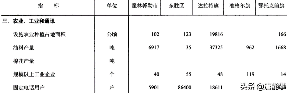 达拉特旗的设施农业高达19816公顷,也就是198平方公里,占全县面积的2.4%,显然主要在北部的沿黄河平原。其他各县的设施农业都不到达拉特旗的1%,一方面是没有地形条件,另一方面志不在此。设施农业不只是大鹏,还有灌溉、施肥、农机等要求,因此为达到高产,也涉及投资。因此达拉特旗的油料(花生、油菜等,不含豆类)产量远超其余各县。