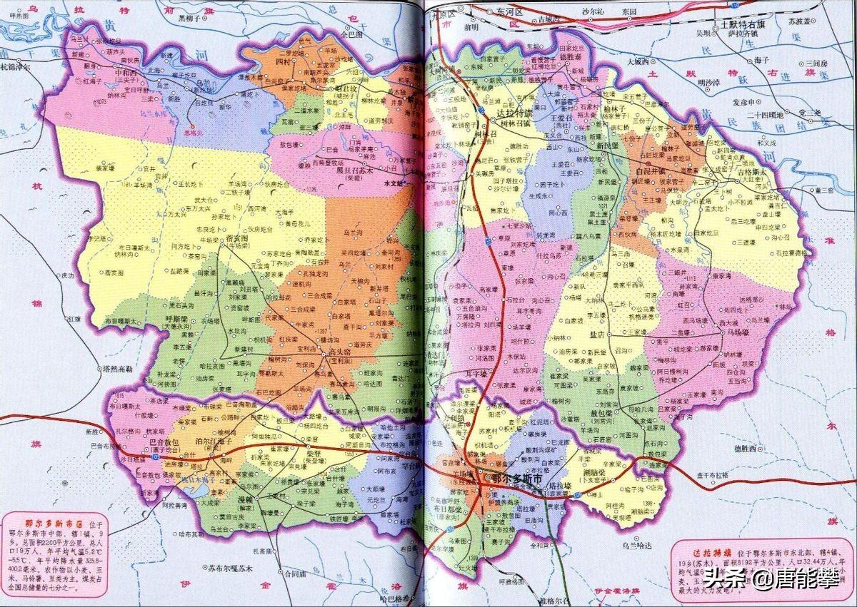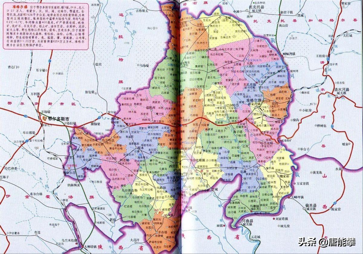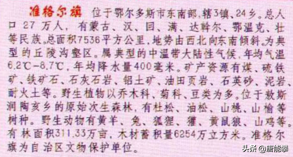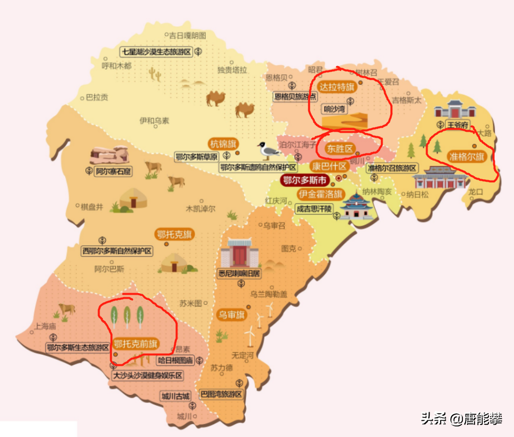 1.1自然地理。达拉特旗和准格尔旗靠近鄂尔多斯的城区东胜区和康巴什区。达拉特旗在市区以北,与包头以黄河为界,辖区包括沿黄河平原、库布齐沙漠(有知名景点响沙湾)和南边的丘陵。准格尔旗位于市区以东,与呼和浩特、包头以黄河为界,多丘陵,县城薛家湾镇海拔约1150米,县域的准格尔煤田称全国最大。东胜区距离主城区康巴什区约20公里,中间正在被工业区填满。鄂托克前旗在鄂尔多斯西部,与宁夏和陕西接壤,县城敖勒召其镇在一片海拔约1350米的平原上,县域的上海庙镇规划水平不亚于普通地级市。霍林郭勒为通辽的一座煤炭资源型县级市。