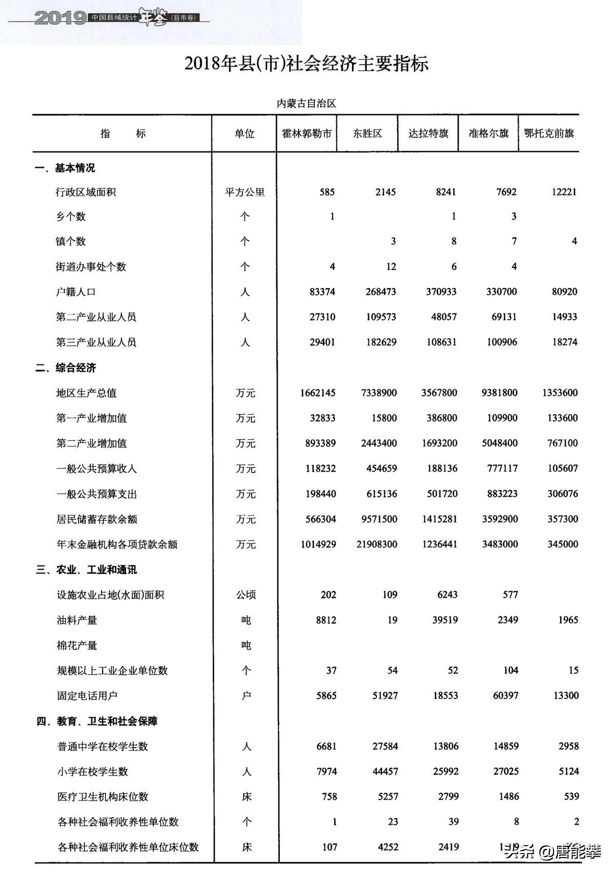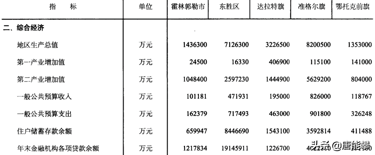 总之,东胜区作为鄂尔多斯的城区之一,人均存款20万元,比肩一线,吸引了大量外来人口,常住人口超过户籍人口2倍,但最近10年已经没有增长。准格尔旗作为全国百强县,大工业数量、工业产值和工业比例都很高,人均存款超10万,吸引了近3万外地人常住。达拉特旗户籍人口最多,有4万就近外流到鄂尔多斯、包头市区等,人均gdp和人均存款在5县最低。鄂托克前旗面积最大,人口最少,地广人稀是真,地大物博存疑,人均存款在鄂尔多斯来说算低的,但在外面来说不低。霍林郭勒人口和面积都是双小县,但也是工业强县,当地40%都是外地人,人均gdp高(13万元),人均存款也很高(6万元)。