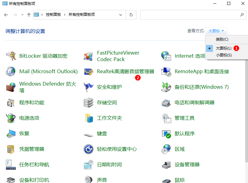 1.在Windows搜索中键入“操作面板”并开启Windows操作面板选项。在列表中寻找查询方法,将其改为大图标,然后在控制面板中寻找。Realtek打开高清晰度的音频管理工具。