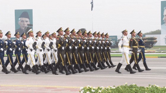 3月23日,应巴铁军方邀请,中国人民解放军仪仗司礼大队组成36人方队亮相巴铁国庆阅兵典礼,其中旗组3人,分队长3人,3个排面,每排10人。