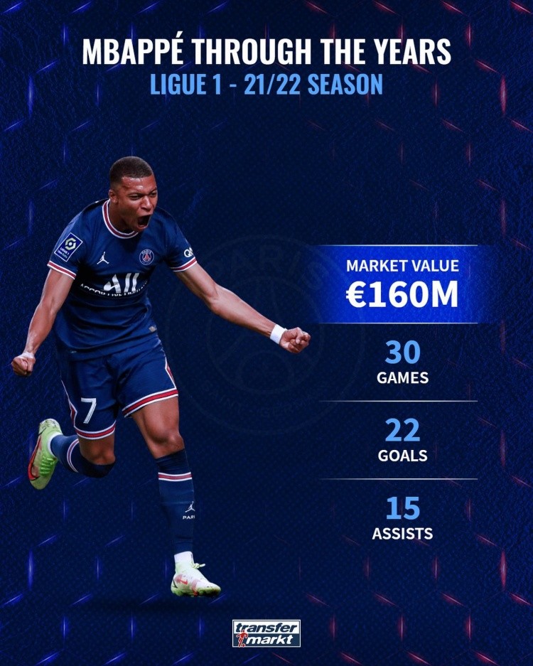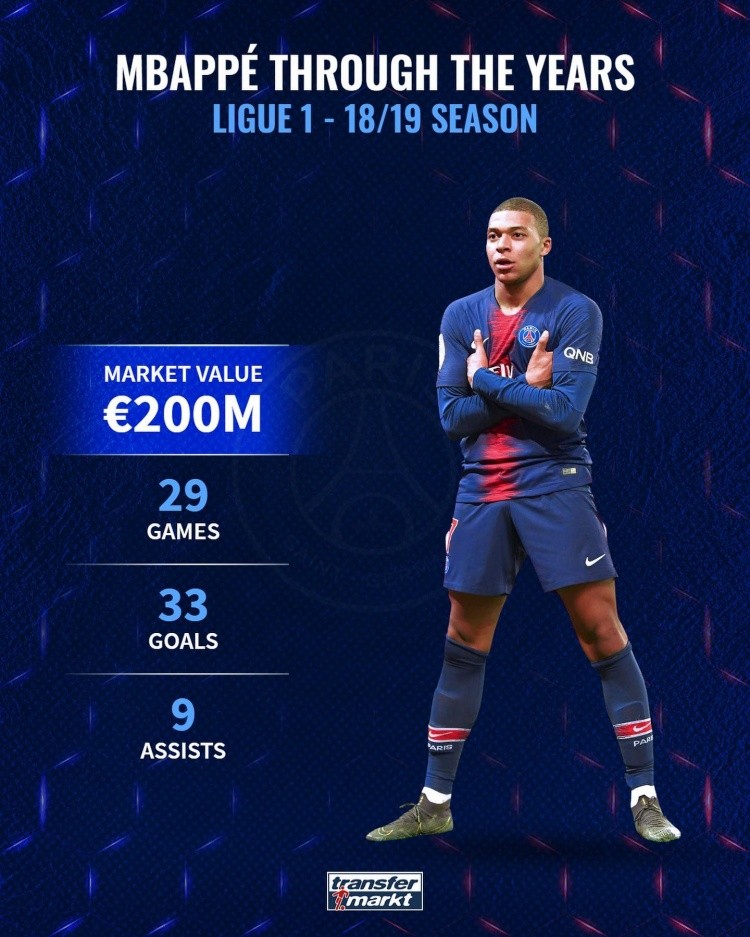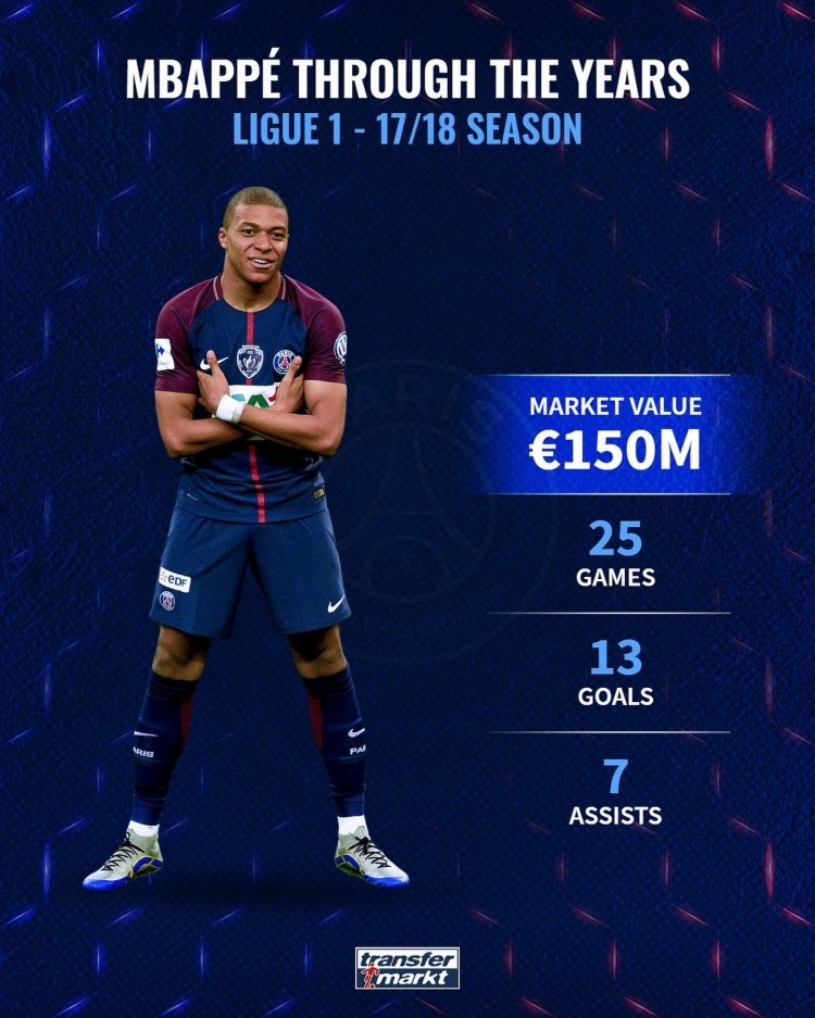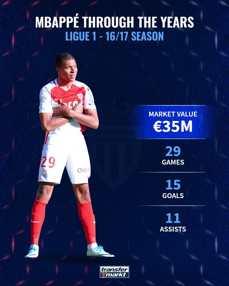 德转列姆巴佩历年身价:两年从3500万涨至2亿欧,目前1.6亿欧