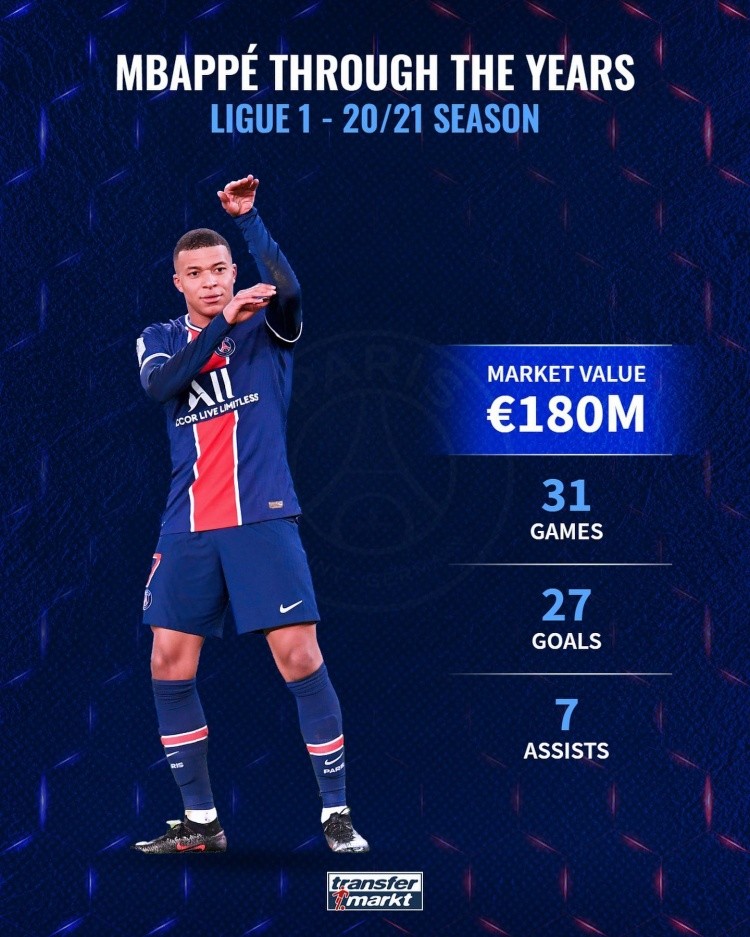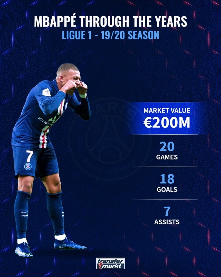 直播吧4月23日讯 德国转会市场网站列出了姆巴佩的历年身价和联赛数据,这位法国射手最高身价曾达到2亿欧,目前为1.6亿欧。