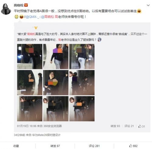 1月19日,有媒体发了一组高晓松的照片,并称其吃了脸大的亏,其实身材并不臃肿,还很有“曲线美”。21日中午,高晓松转发该组照片,并幽默回应“平时照镜子老觉得A面很一般,没想到优点在B面哈哈。以后有重要场合可以试试倒着走。”照片中,高晓松身穿黑色上衣配浅色牛仔裤,全身来看比平时只看头部和上身显得瘦了不少。