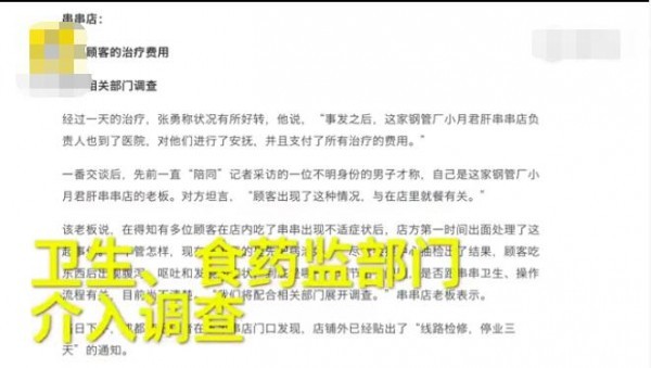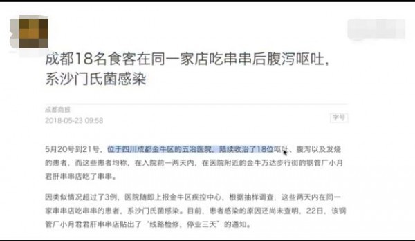近日,成都一医院收治了18位呕吐、腹泻及发烧的患者,他们称曾在“钢管厂小月君肝”吃过串串。