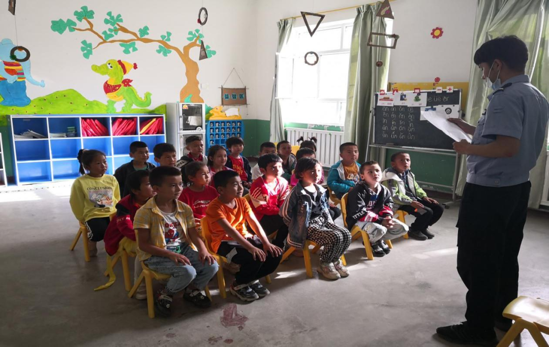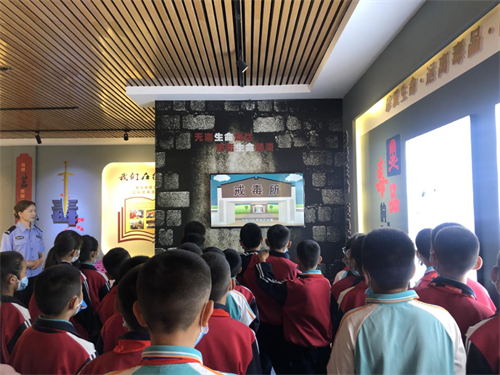 禁毒民警向小同学讲述“虎门销烟”事件的由来,介绍常见毒品的种类、形状及吸食后对身体造成的伤害,让同学们能够将禁毒、拒毒的思想根植在心中。