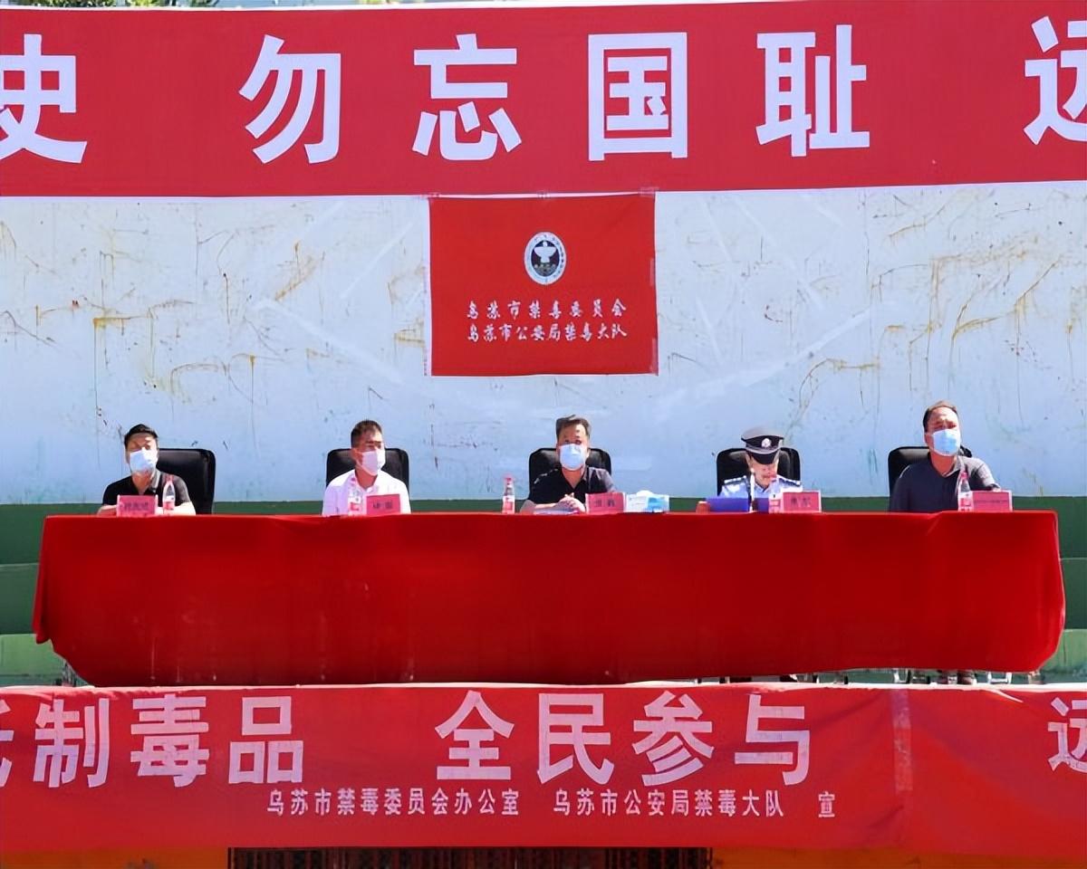 乌苏市禁毒委员会主任为青年志愿者代表授旗,带领学生们一起进行禁毒誓言。工作人员向师生进行毒品讲解、介绍虎门硝烟和林则徐禁烟历史、带领学生参观仿真毒品。