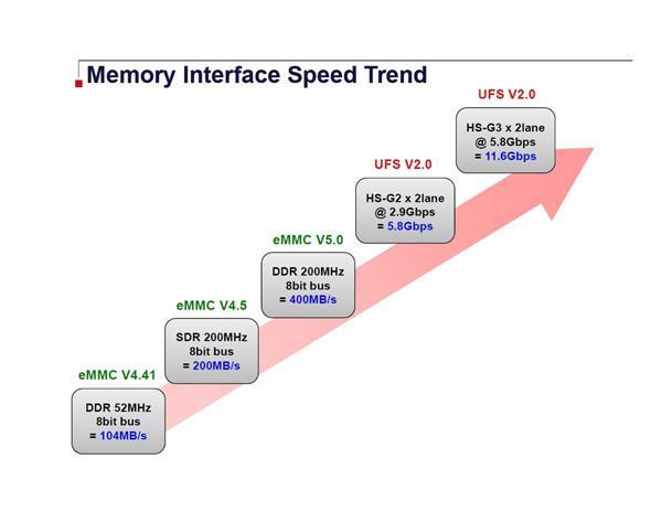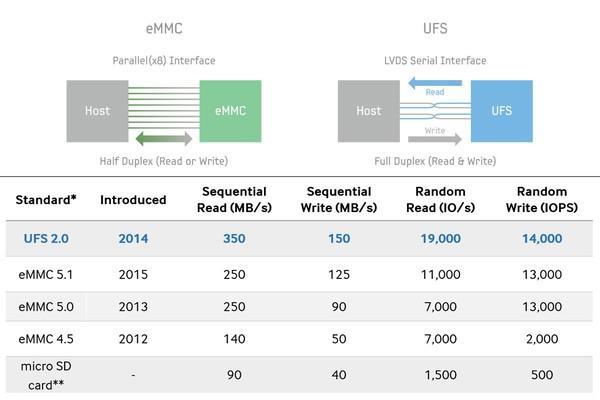 从上图中我们还可以看出,UFS2.0与eMMC5.1的存取速度有着巨大的区别,可以说是。那UFS2.0与UFS2.1有什么区别呢?常见的是下图,很多人解释说采用HS-G3接口的就是UFS 2.1,那就是速度更快一点。
