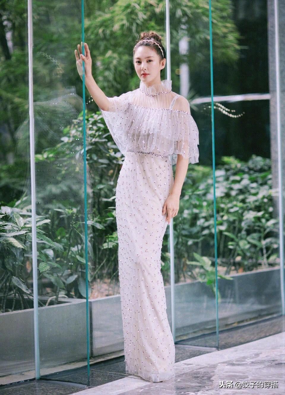 梳着高丸子头搭配白色发箍,甜美又少女,梳着头发露出整张脸,立体又精致的五官美的无瑕疵,身穿薄纱连衣裙,荷叶边的设计又仙又甜,女神范十足。