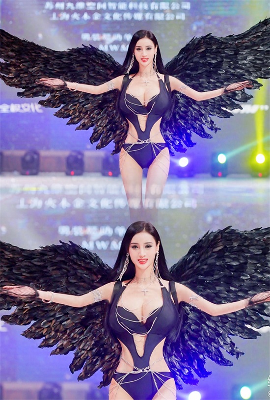 这几张照片中,吴春怡身穿黑色泳衣,背戴着黑色翅膀,在T台上走秀。只见她走秀过程中,面带笑容,轻松自如,身材超级棒。