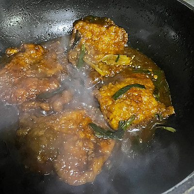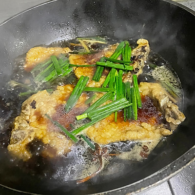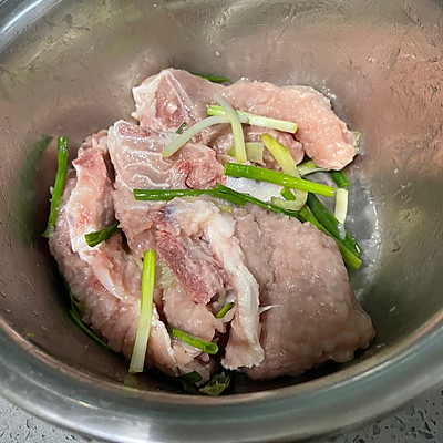 7、放入大排,加水没过大排,加盐、冰糖、生抽、老抽、八角,葱,盖上盖子中火煮